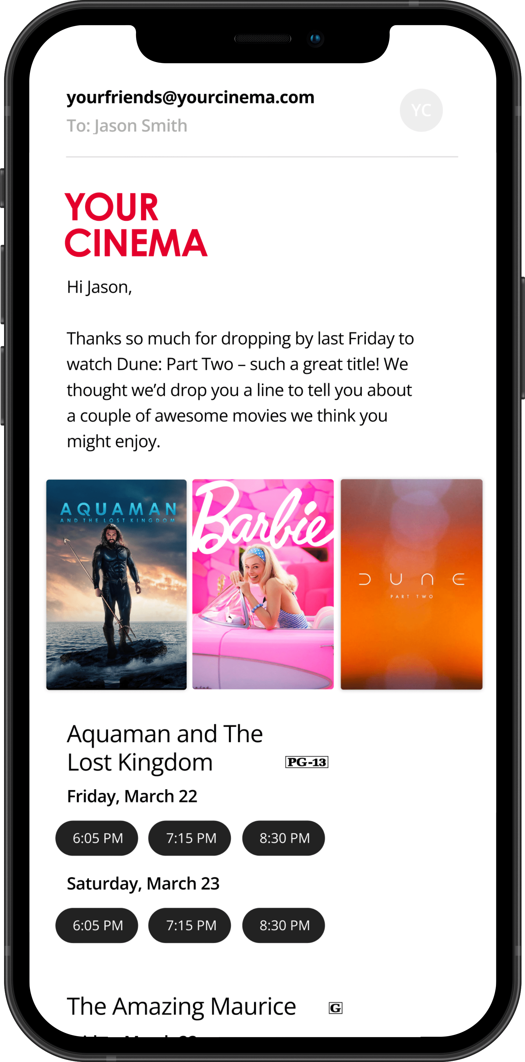 Seamlessly drag and drop an email blast. Our CRM for cinemas automatically integrates with our Movie & Showtimes database, which means all your movies, showtimes, and synopses automatically display without you having to type anything.