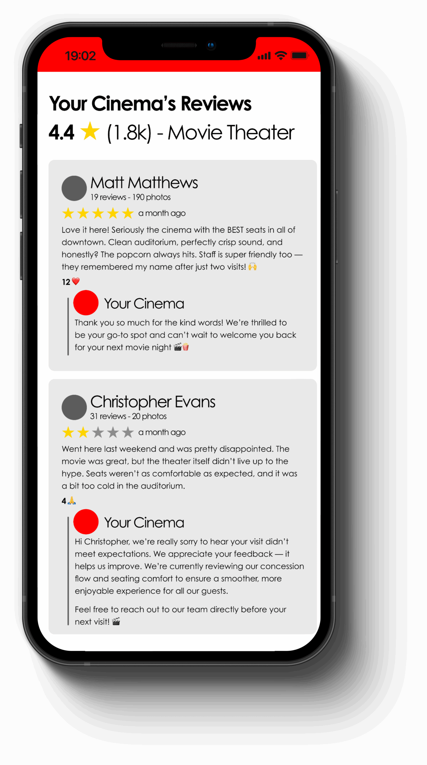 Don’t let negative reviews go unanswered. We help you manage your online reputation by crafting thoughtful responses that highlight your cinema’s commitment to guest experience — while amplifying the positive feedback that keeps audiences coming back.