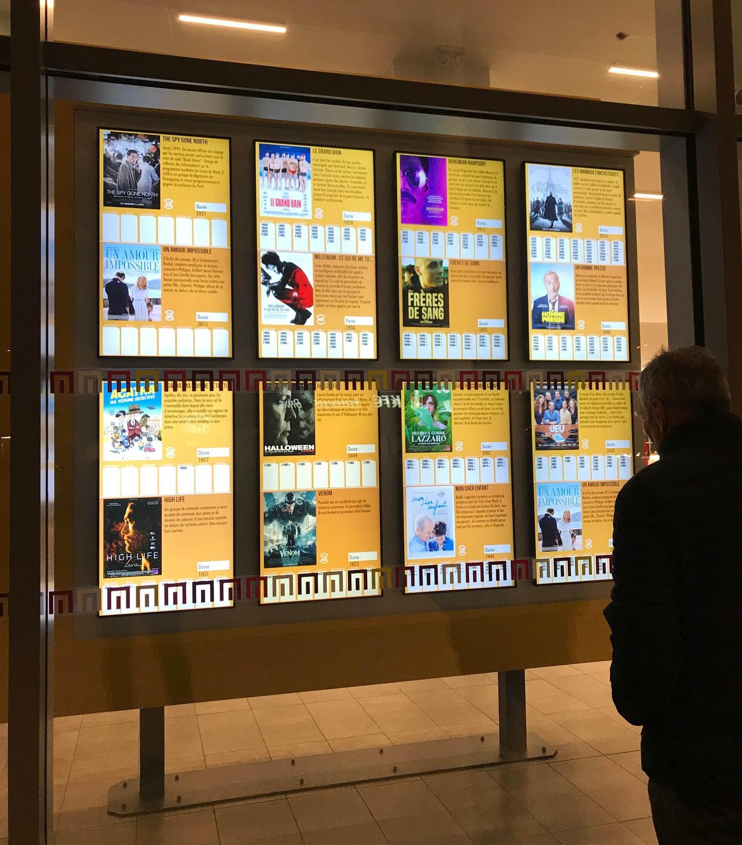 La majorité des écrans fonctionnent en mode automatique pour afficher vos informations sans intervention de votre part. Nous proposons de nombreuses mises en page différentes, chacune adaptée aux lieux stratégiques du cinéma : affichage en façade, hall d’accueil, comptoirs, contrôle et accès aux salles.