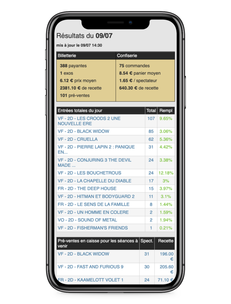 Suivez l’activité de votre cinéma en temps réel : billetterie, confiserie, indicateurs de remplissage, de prix moyen…