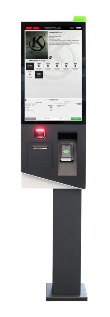Une borne toute de noir vêtue, avec une alimentation modulaire pour une sécurisation électrique optimale de l’écran de 27 pouces et de tous les éléments : lecteur optique, imprimante, et et TPE monobloc ultra performant.