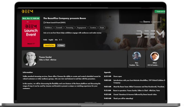 Organizaremos un evento de lanzamiento el 17 de marzo, para mostrarle la flexibilidad y las principales características de la plataforma Beem. Y lo que es más importante, nos aseguraremos de cubrir las formas en las que puede ser utilizada por cines, festivales, marcas o incluso eventos internos de los empleados, presentando una experiencia única de co-vigilancia.
